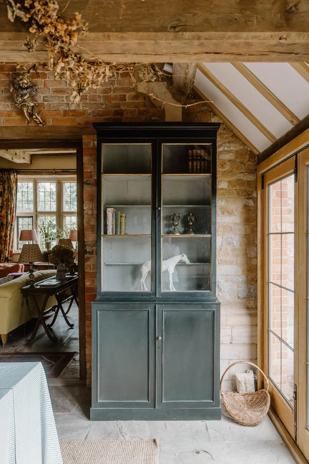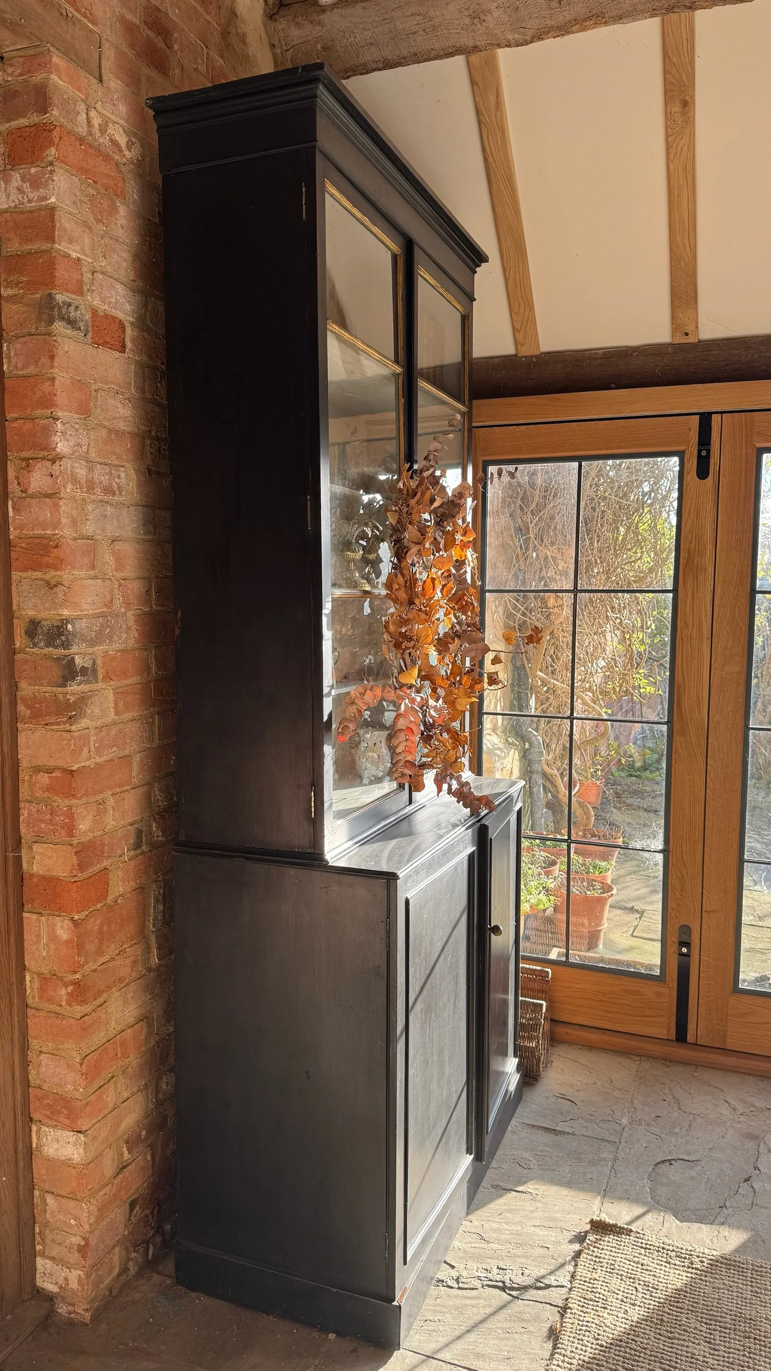 A late Victorian/ early Edwardian black painted dresser with glazed panel doors. Two deep and two shallow shelves in upper section and one shelf in bottom cupboard. Pale blue painted interior.
